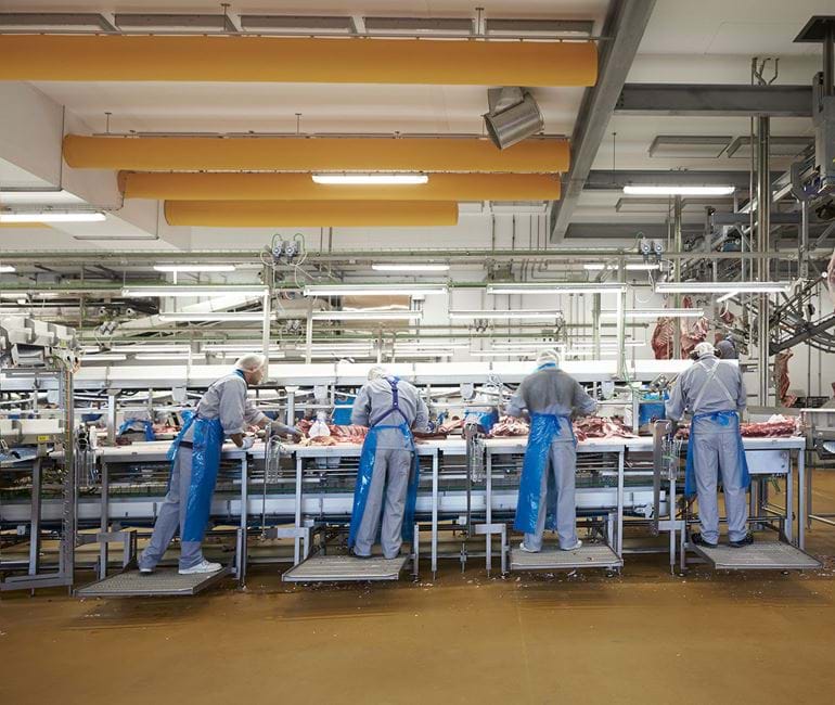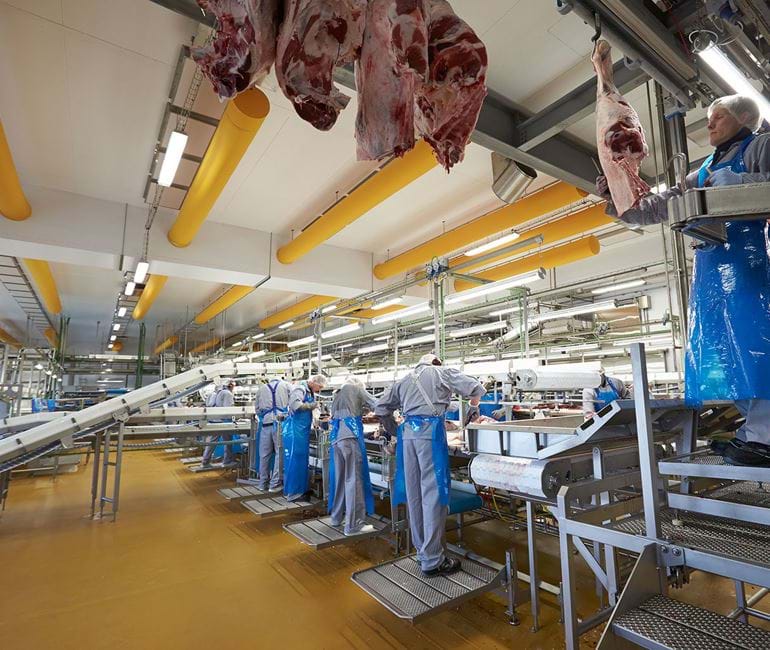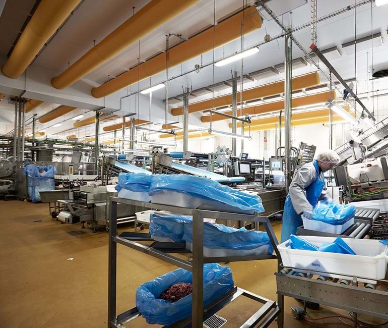 Textile based ventilation was installed in a meat processing room and in three cutting rooms. To avoid condensation laser-cut holes in the duct fabric direct the air towards the ceiling, providing an aircoating of the surface.