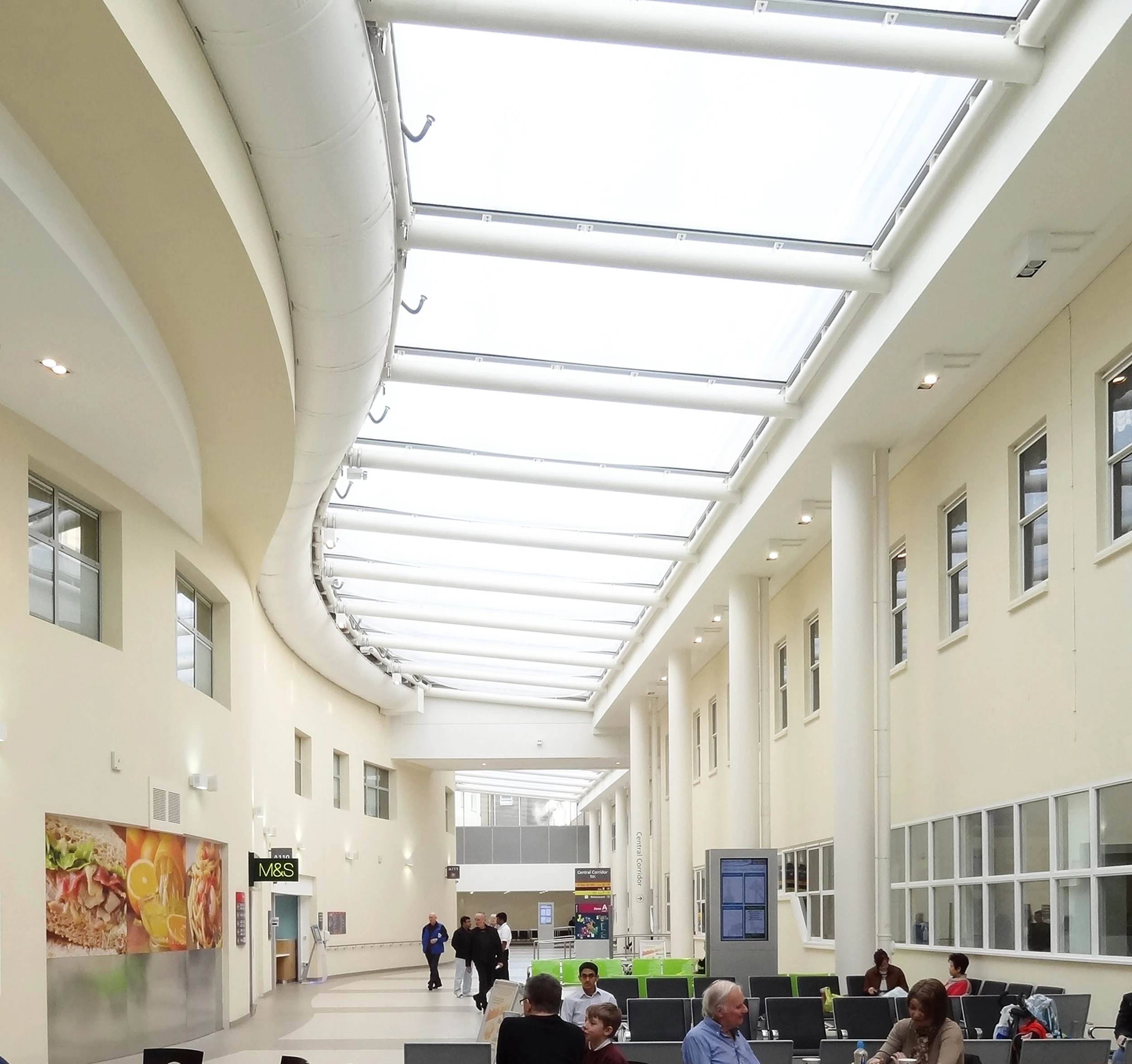 Da Broomfield Hospital skulle have etableret et nyt ventilationssystem i atriumgården, der forbinder hovedbygningen med en ny fløj, var både funktion og arkitektur i fokus. Atriet fungerer som et centralt bindeled i bygningen med stor daglig aktivitet, og derfor var der høje krav til både komfort, luftkvalitet og det visuelle udtryk.