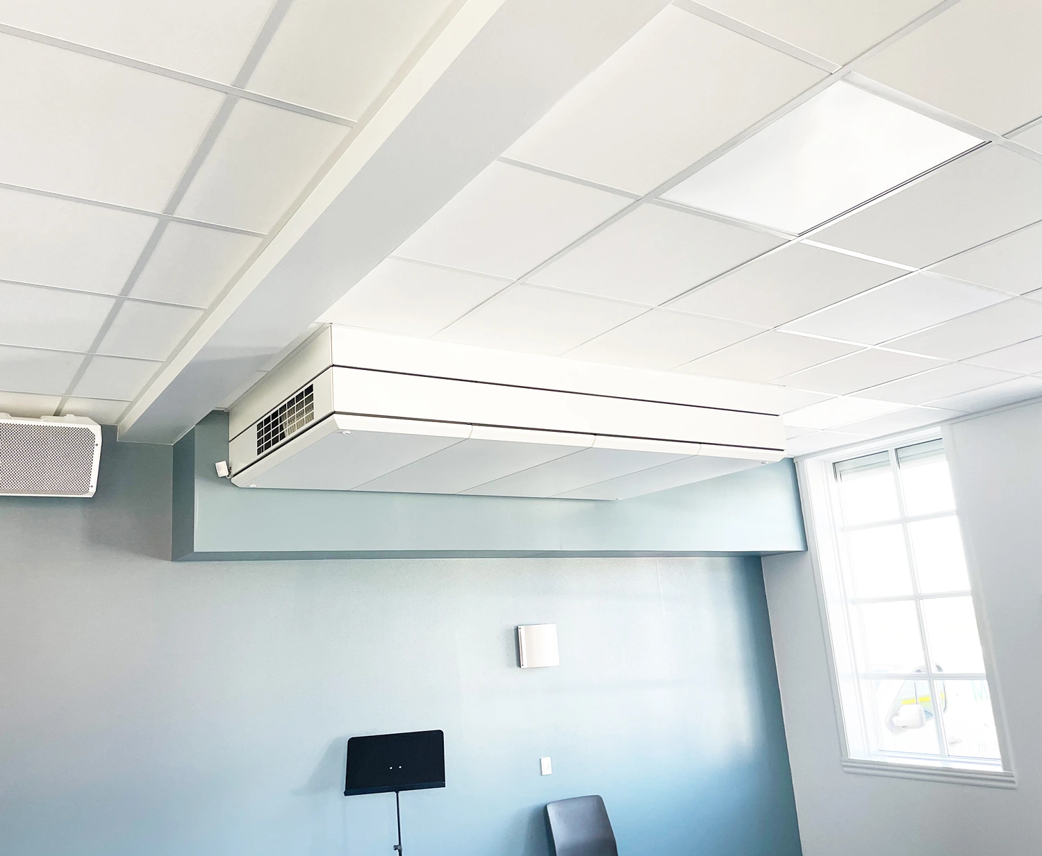 På Hårslev Efterskole blev panelet leveret i hvid, så det harmonerer med loftets øvrige design og bidrager til et lyst og indbydende rum. Kombinationen af funktionalitet og æstetik gør løsningen velegnet i undervisningsmiljøer, hvor både teknik og arkitektur skal spille sammen.