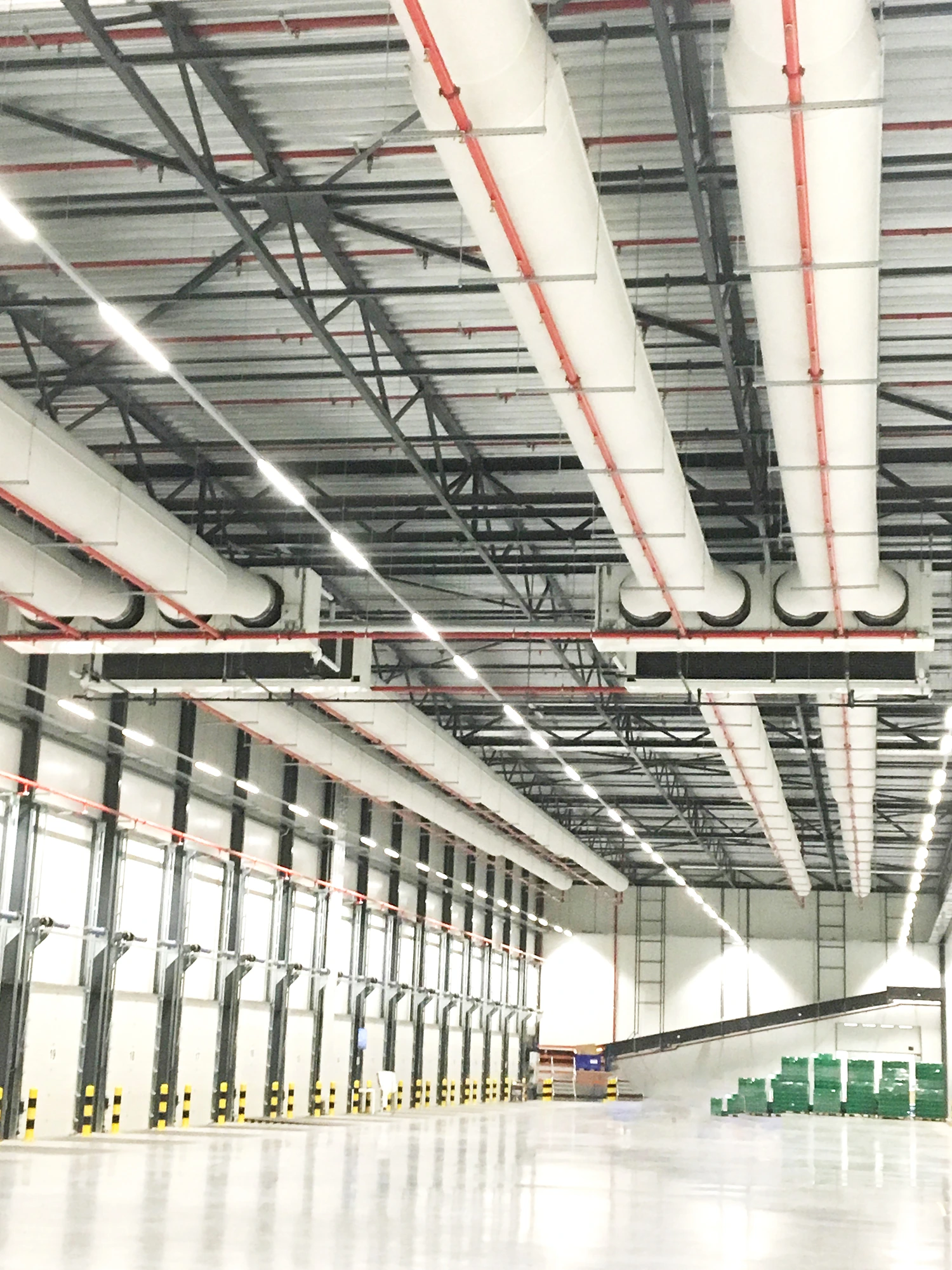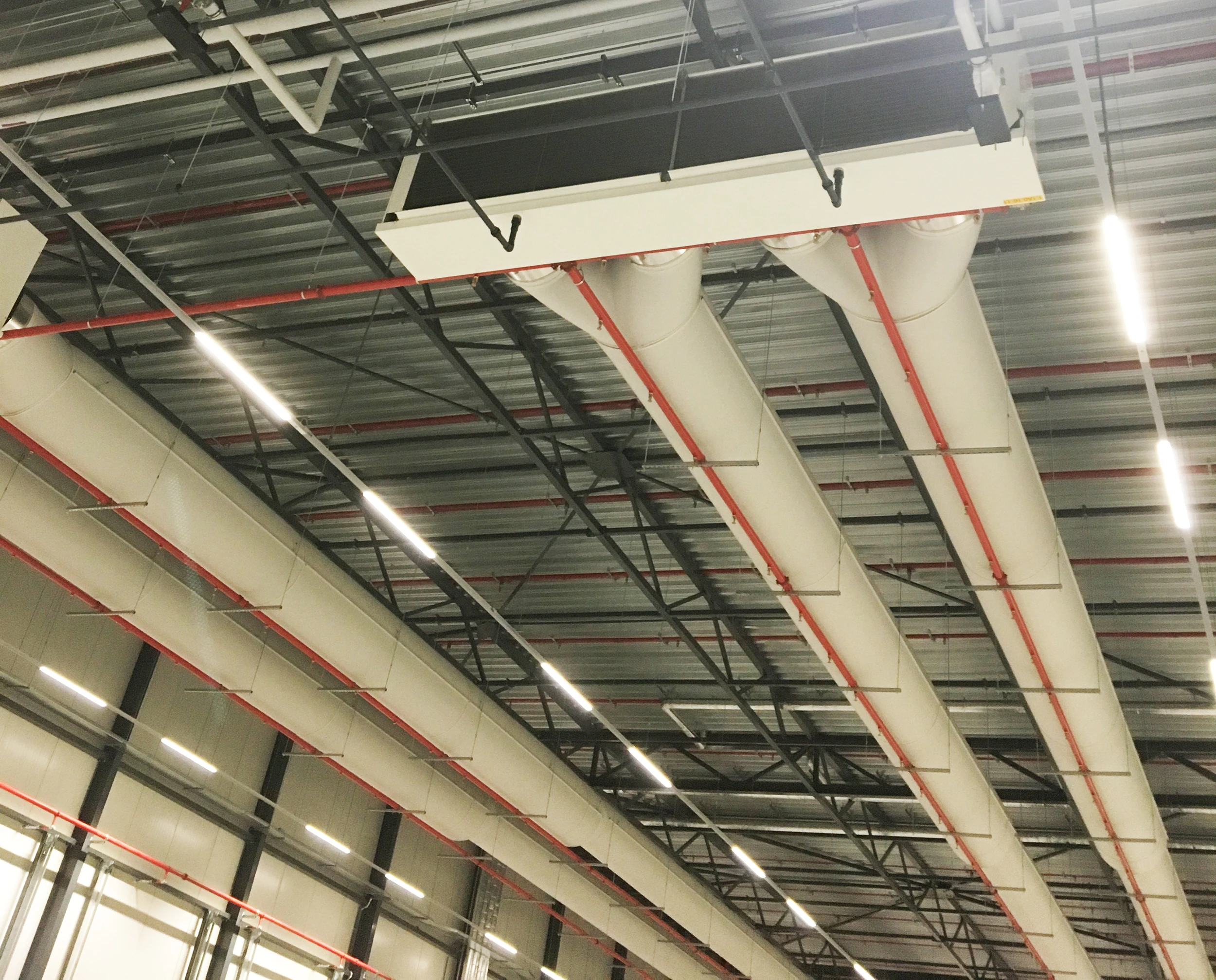 Tekstilbaseret ventilation i et højlager hos Hello Fresh sikrer en ensartet luftfordeling ved at distribuere luften jævnt over hele lagerets højde og længde. I høje rum kan varm eller kold luft ellers samle sig i lag, men tekstilkanaler med præcist tilpassede perforeringer skaber en kontrolleret og trækfri luftstrøm, der modvirker temperaturforskelle mellem gulv og loft.
