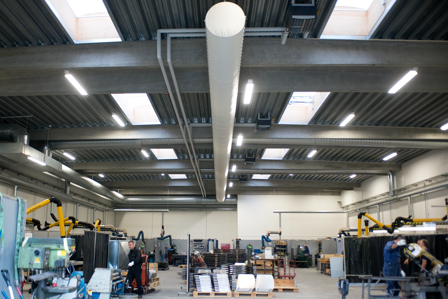 Smede- og maskinfabrikken Larsens Eftf. i Kolding har ved etableringen af sit nye domicil installeret tekstilbaseret ventilation fra KE Fibertec. I produktionshallen sikrer tekstilkanaler med integrerede dyser, at frisk luft fordeles jævnt i opholdszonen, mens FBS-loftpaneler i kontorer, kantine og omklædningsrum skaber trækfri luftfordeling og et behageligt indeklima i administrationsbygningen.