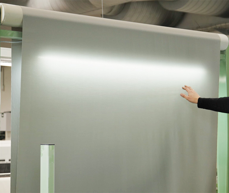 Vores to primære materialer, GreenWeave og MultiWeave, er fremstillet af et grundmateriale af brandhæmmende granulater, der spindes til polyesterfibre. Forskellen på de to materialer er i store træk måden, fibrene spindes på, inden de bliver til det færdige garn. Men fælles for vores materialer er, at de har et ekstremt lavt olieindhold og at vi holder en max. krympningsgrad på under 5%. Det er helt unikt og gør, at vi kan levere vævede tekstilmaterialer af meget høj kvalitet. Netop disse to faktorer er helt afgørende for vores kvalitet, og for at vi kan kontrollere luftgennemtrængeligheden i tekstilmaterialerne. Den indgående viden, som vi har til vores råmaterialer, samt de høje krav, vi stiller til vores underleverandører, gør os i stand til at tilpasse vævningen af tekstilmaterialet til den nøjagtige luftmængde, og hvordan den skal fordeles i et givent rum.