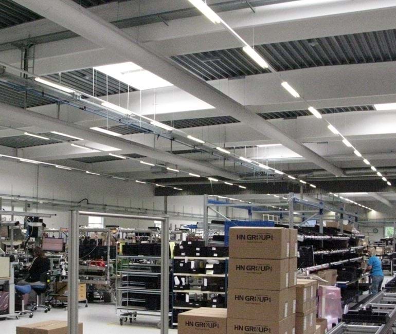 Zur Regelung der Luftverteilung in einem Lagerraum und einer Fertigungsanlage wurde ein textiles Luftverteil- und Kühlsystem in Form von einer KE-Inject®-Lösung installiert.