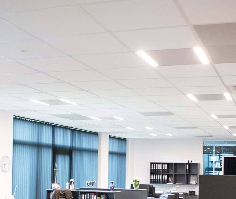 As the top of the panel is made of textile material, it is flexible. This makes the panels ideal for rooms with a low headroom and in rooms with low ceiling heights. At the same time, the panels are fully integrated with the ceiling. See link for approved suspended ceiling types.