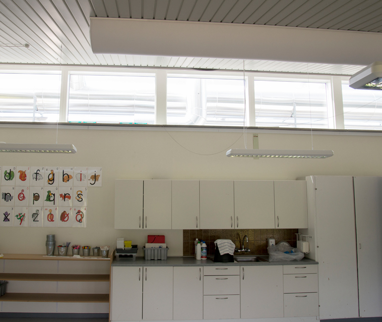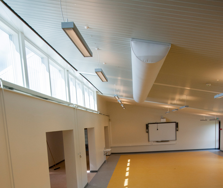 The school was recently renovated, and they installed fabric ducting in the classrooms. Originally, decentralized ventilation was specified, however, the ventilation contractor managed to convince the project owner that fabric ducts would be a better solution that would provide more efficient air distribution and thus a healthy indoor climate.