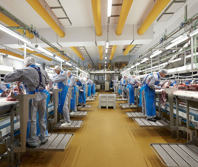 Textile based ventilation was installed in a meat processing room and in three cutting rooms. To avoid condensation, laser-cut holes in the duct fabric direct the air towards the ceiling, providing an aircoating of the surface.