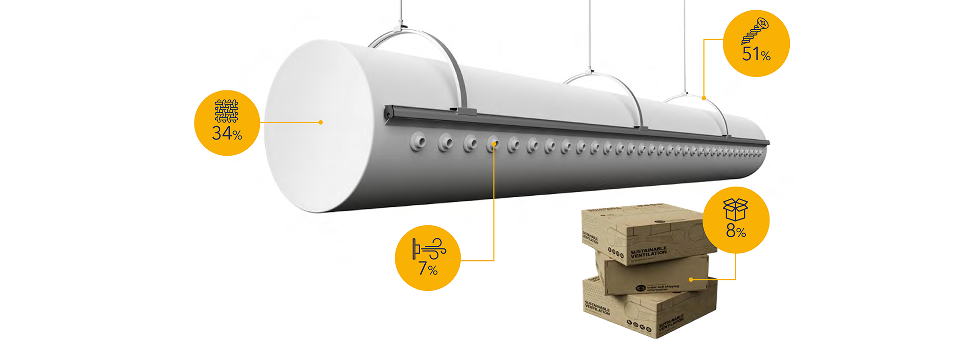 Onze EPD onderscheidt zich doordat het inzicht geef in hoe alle elementen van onze op textiel gebaseerde ventilatieoplossingen het milieu beïnvloeden. Voor alle onderdelen hebben wij berekeningen gemaakt en laten we zien hoeveel de 4 categorieën textiel, assemblage, accessoires en verpakkingen deel uitmaken van de totale klimaatimpact. Zo geeft onze EPD inzicht in de milieu impact bij de keuze voor de textiele ventilatie oplossingen van KE Fibertec.
